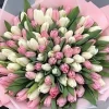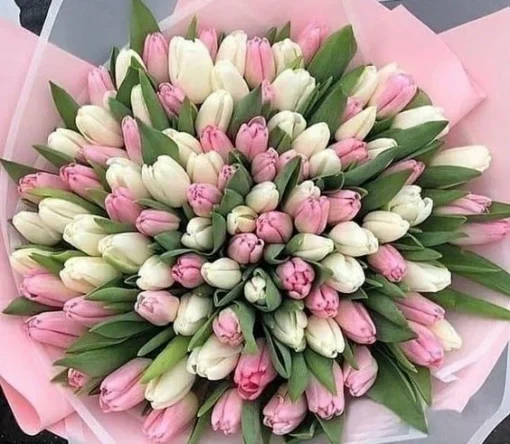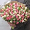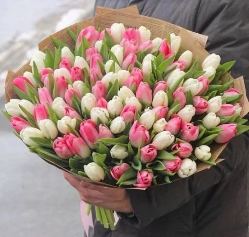 Букет из 101 белого и розового тюльпана в стильной упаковке.