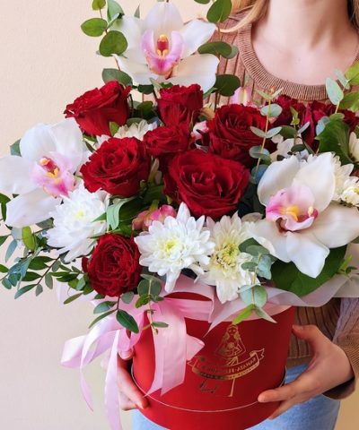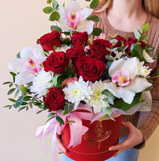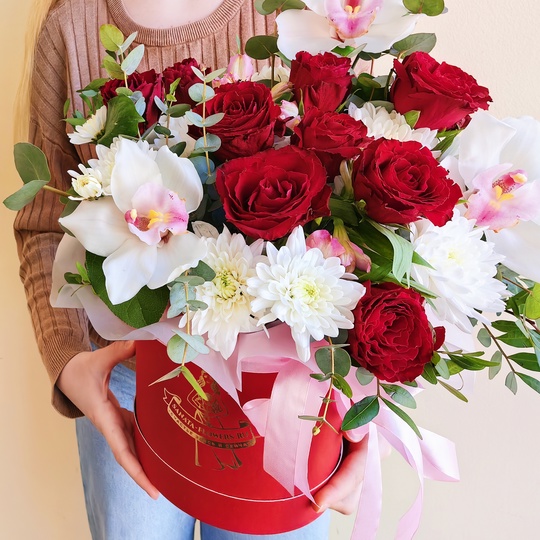 Композиция в шляпной коробке с красными розами и хризантемами