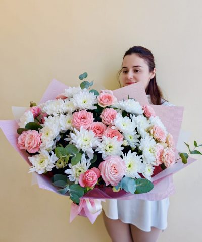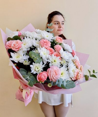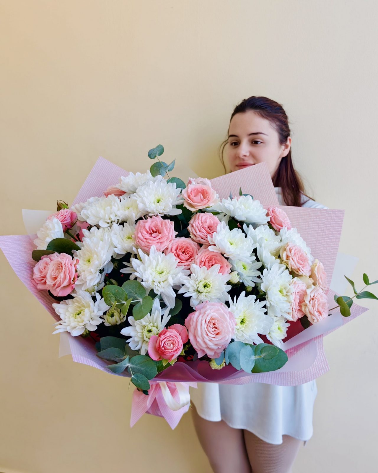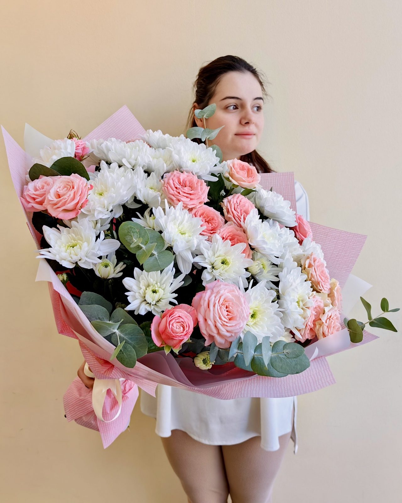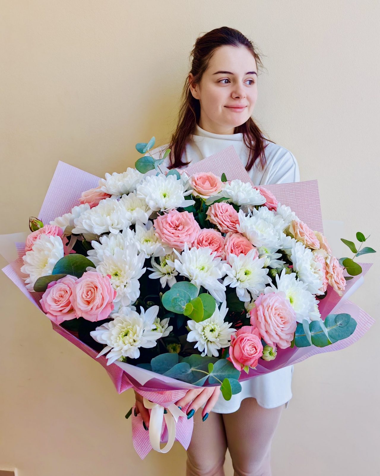 Популярный букет из кустовых хризантем 5 шт и кустовых роз 7 шт с эвкалиптом.