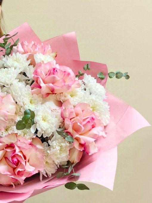 Нежный букет с розовыми французскими розами и хризантемой🌺 45см ширина букета В составе: Роза французская 7 шт Кустовая хризантема 6 шт Эвкалипт Упаковка В подарок: – Дизайнерская упаковка – Инструкция по уходу – Средство для продления жизни цветов 2 шт 🌷 Экспресс-доставка 🌷 Кешбэк от суммы заказа 🌷 Открытка в подарок 🌷 Фотоотчет перед отправкой