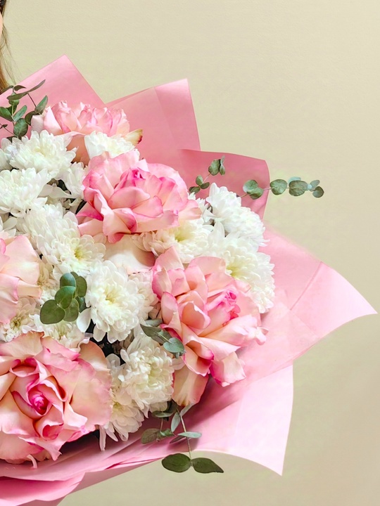 Нежный букет с розовыми французскими розами и хризантемой🌺 45см ширина букета В составе: Роза французская 7 шт Кустовая хризантема 6 шт Эвкалипт Упаковка В подарок: — Дизайнерская упаковка — Инструкция по уходу — Средство для продления жизни цветов 2 шт 🌷 Экспресс-доставка 🌷 Кешбэк от суммы заказа 🌷 Открытка в подарок 🌷 Фотоотчет перед отправкой