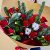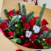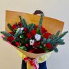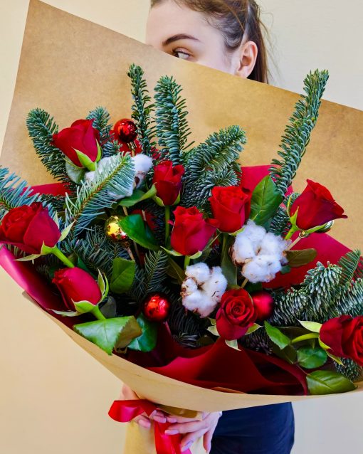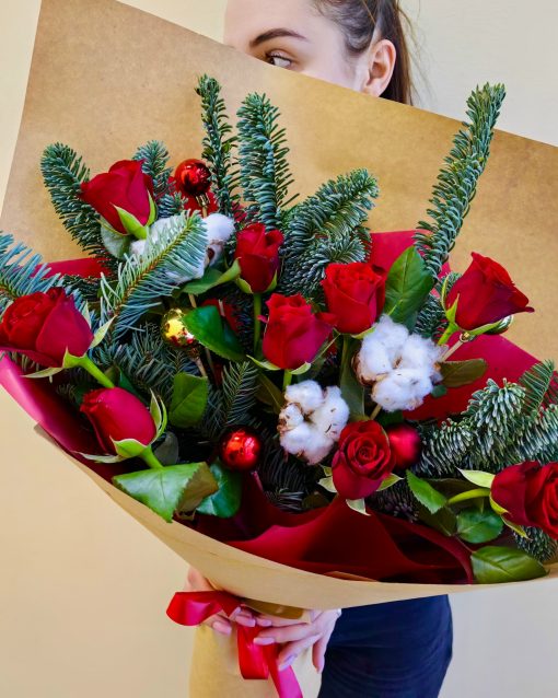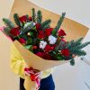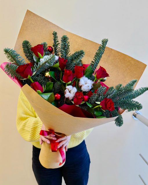 Новогодний букет с голландской елкой, которая не осыпается 🎄 В составе розы красные 9 шт, хлопок 3 шт, елочные игрушки 5 шт, упаковка крафт 🌹 ширина 45см высота 40см