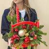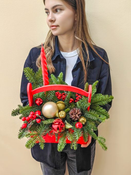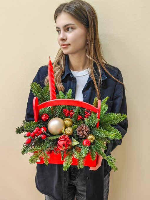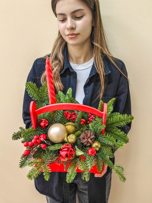 Новогодняя композиция в красном цвете с живой голландской ёлкой Нобилис🌲🎅 Размеры: ширина 21см, длина 24см Небольшая композиция в деревянном ящике с разнообразным декором: шишки, искуственные ягодки, ёлочные шары разных размеров и свеча! Композиция станет отличным подарком на Новый год для ваших близких🎄🎁 Можем собрать в другом цвете и с декором на ваш вкус.