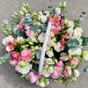 Объёмная корзина с кустовыми розами и эустомой #202