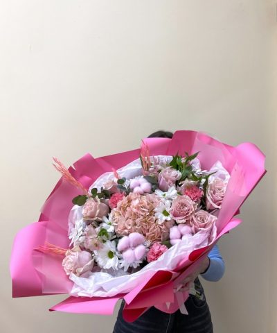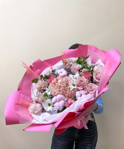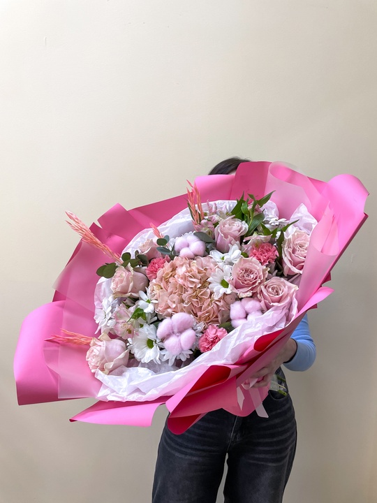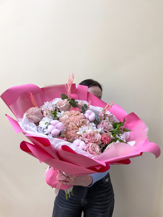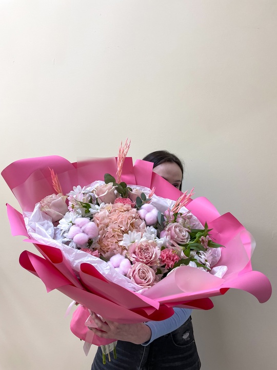 Сборный букет в стильной упаковке Состав букета: Хлопок 3 шт Хризантема 5 шт Роза 7 шт Альстромерия 3 шт Гвоздика 3 шт Эвкалипт Гортензия Сухоцветы В подарок: — Дизайнерская упаковка — Инструкция по уходу — Средство для продления жизни цветов 2 шт 🌷 Экспресс-доставка 🌷 Кешбэк от суммы заказа 🌷 Открытка в подарок 🌷 Фотоотчет перед отправкой