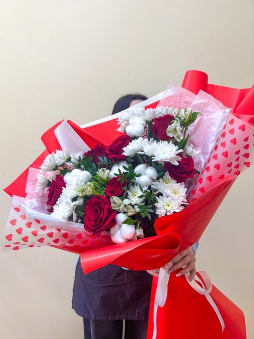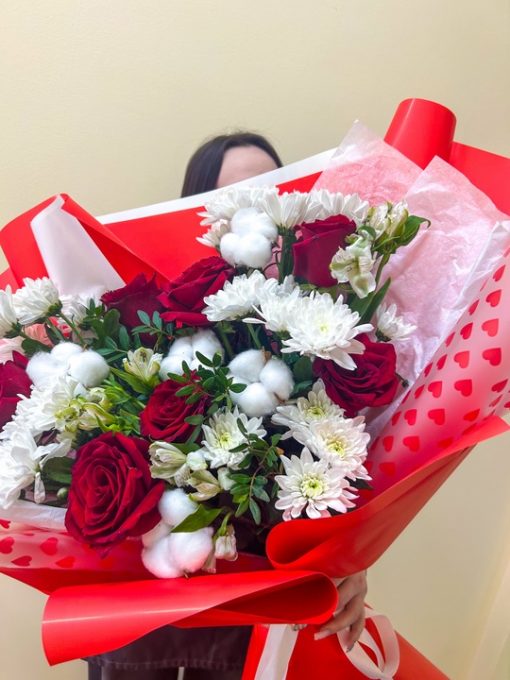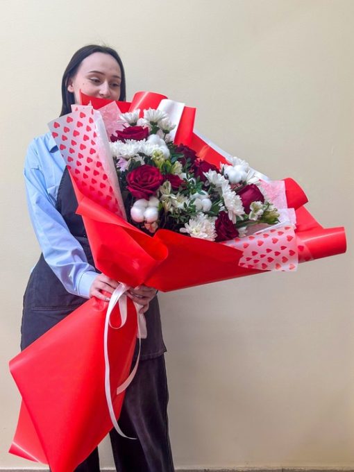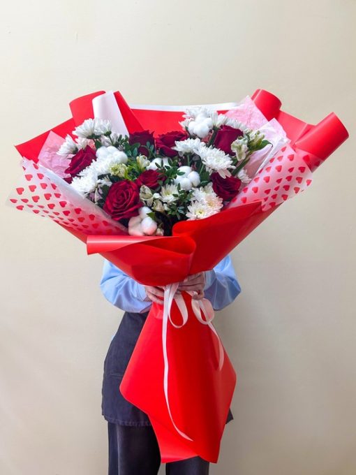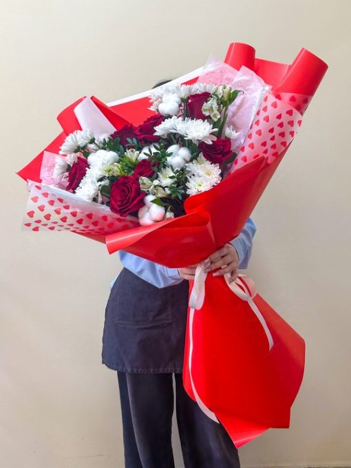 Сборный букет-гигант в авторской упаковке💐😯 Ширина 70см, Высота 60см В составе: Роза красная Эквадор 7 шт 60см Хризантема 5 шт Альстромерия 3 шт Хлопок 3 шт Фисташка В подарок: – Дизайнерская упаковка – Инструкция по уходу – Средство для продления жизни цветов 2 шт 🌷 Экспресс-доставка 🌷 Кешбэк от суммы заказа 🌷 Открытка в подарок 🌷 Фотоотчет перед отправко