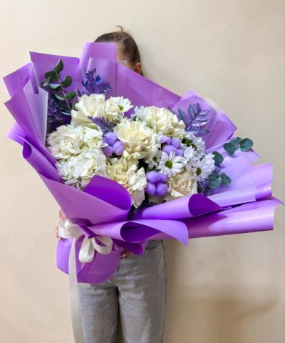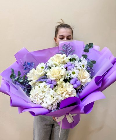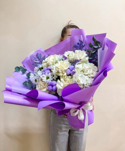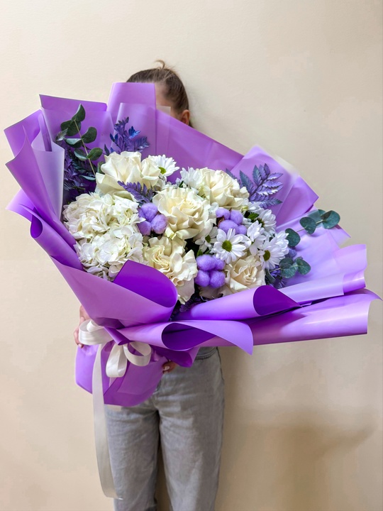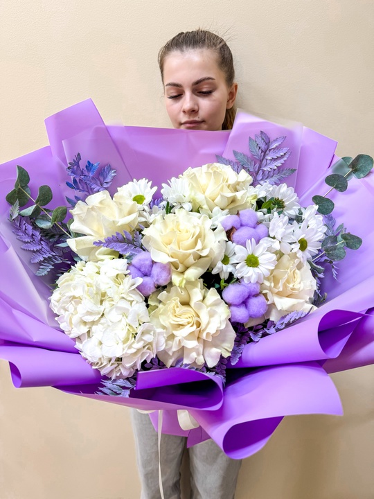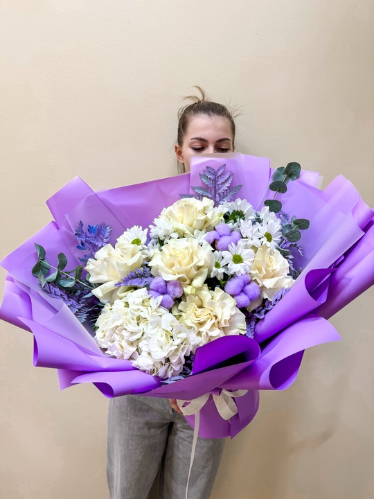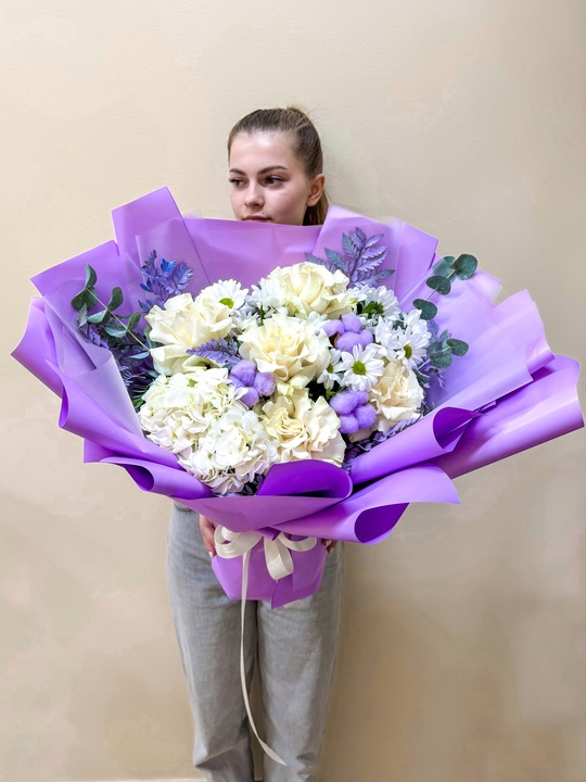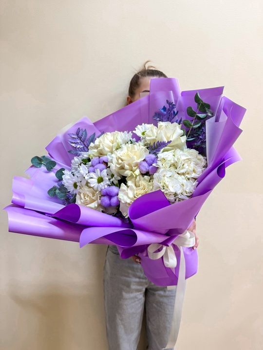 Букет из французской розы и хризантемы в стильной авторской упаковке💜
