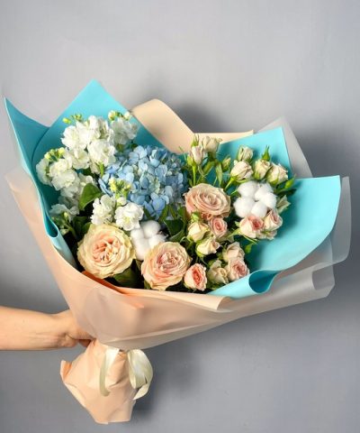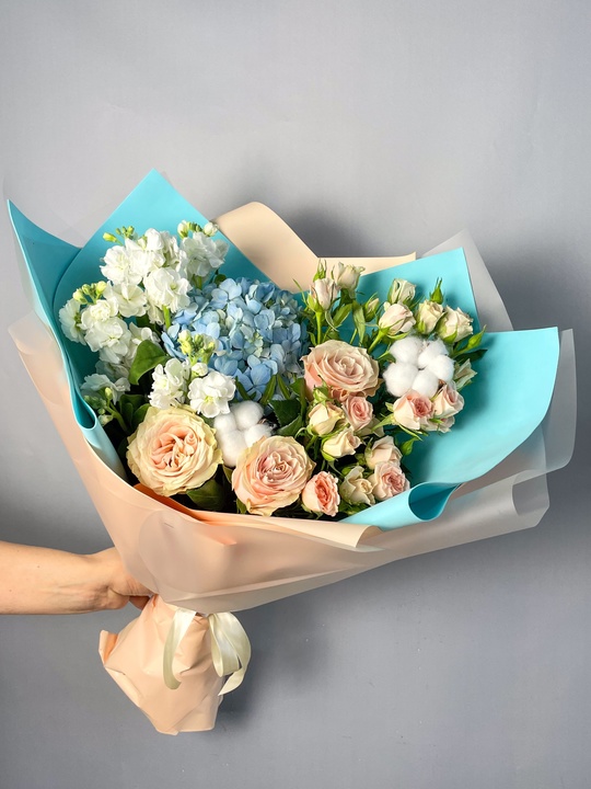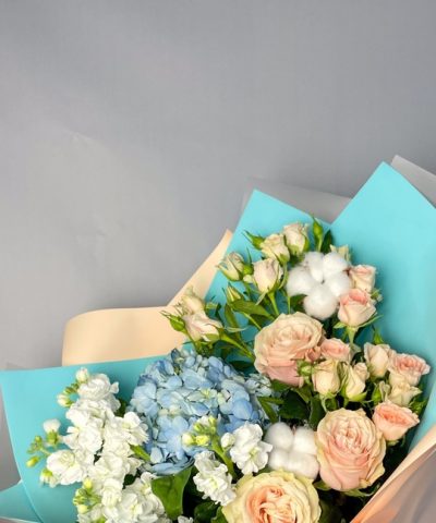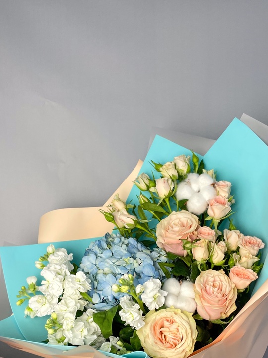 Букет из роз, маттиолы и гортензии В составе: Кустовая роза 4 шт Маттиола 2 шт Роза 3 шт Гортензия Хлопок 2 шт В подарок: — Дизайнерская упаковка — Инструкция по уходу — Средство для продления жизни цветов 2 шт 🌷 Экспресс-доставка 🌷 Кешбэк от суммы заказа 🌷 Открытка в подарок 🌷 Фотоотчет перед отправкой