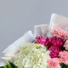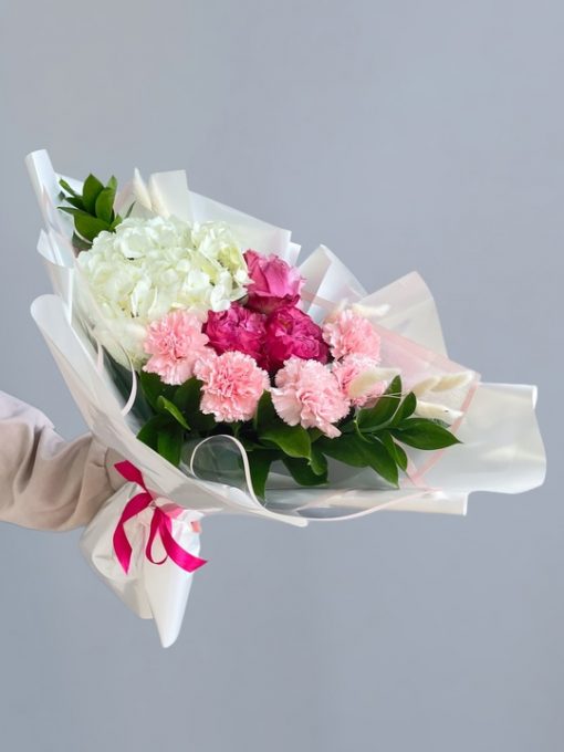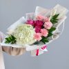 Сборный букет с диантусом, пионовидной розой, гортензией