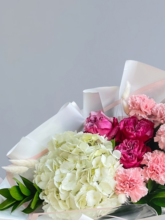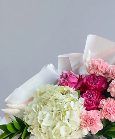 Сборный букет с диантусом, пионовидной розой и гортензией Ширина 35см, высота 45см В составе: Пионовидная роза 3 шт Гортензия 1 шт Диантус 5 шт Рускус 5 шт Лагурус Упаковка В подарок: — Дизайнерская упаковка — Инструкция по уходу — Средство для продления жизни цветов 2 шт 🌷 Экспресс-доставка 🌷 Кешбэк от суммы заказа 🌷 Открытка в подарок 🌷 Фотоотчет перед отправкой