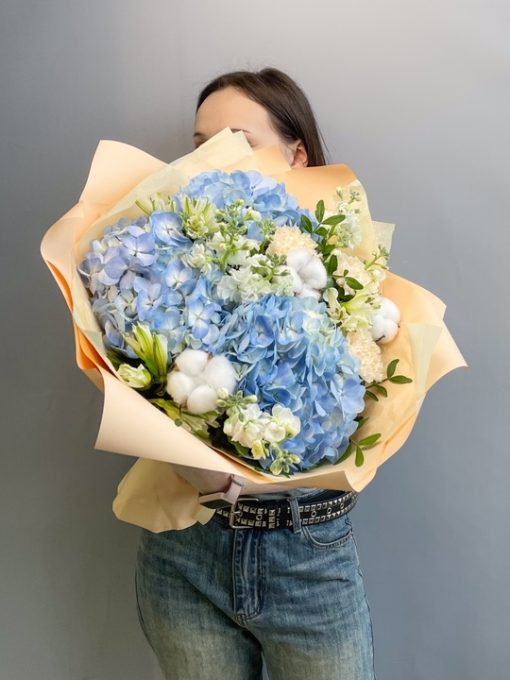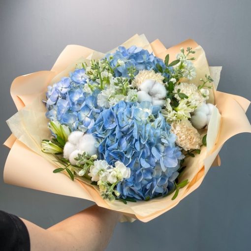 Сборный букет с гортензией🌿💙 Высота 45см, Ширина 47см В составе: Маттиола 3 шт Гортензия 3 шт Альстромерия 3 шт Фисташка 2 шт Гвоздика 3 шт Хлопок 3 шт Упаковка В подарок: – Дизайнерская упаковка – Инструкция по уходу – Средство для продления жизни цветов 2 шт 🌷 Экспресс-доставка 🌷 Кешбэк от суммы заказа 🌷 Открытка в подарок 🌷 Фотоотчет перед отправкой