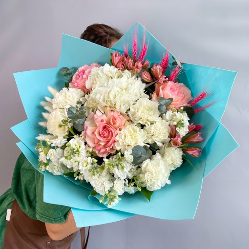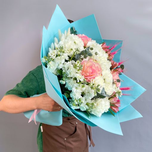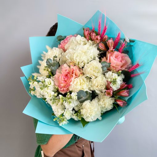 Сборный букет с гвоздикой, альстромерией, французской розой Ширина 45см, высота 50см