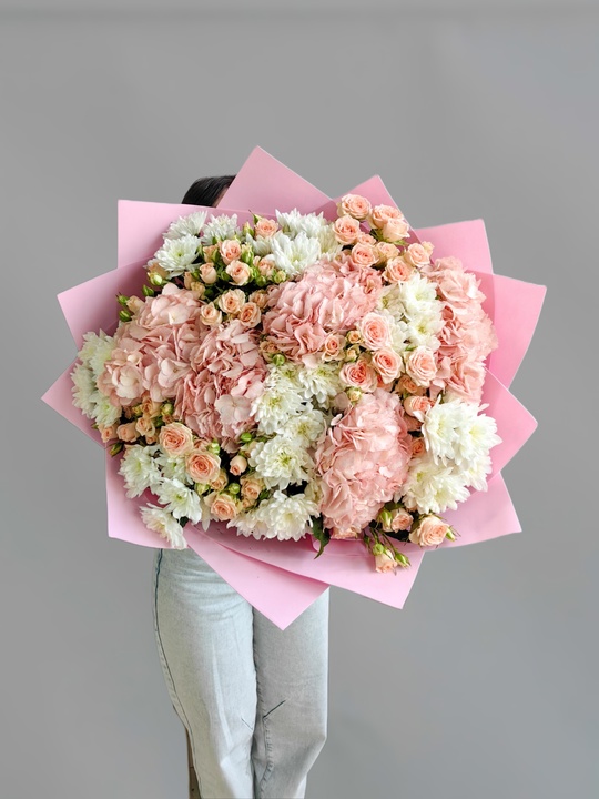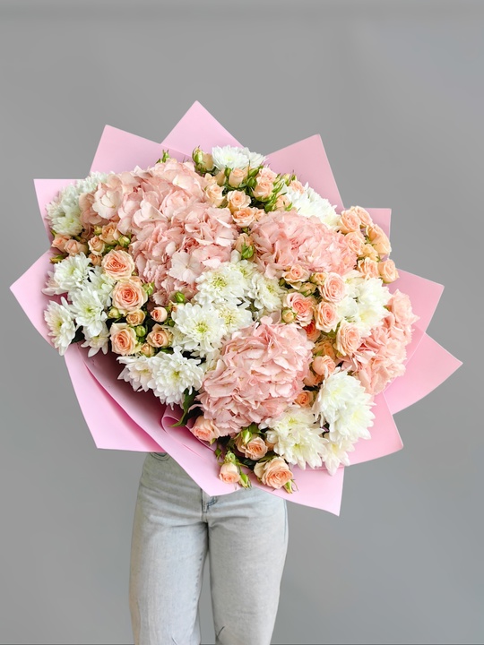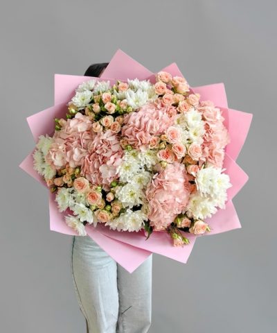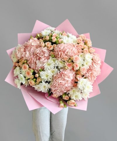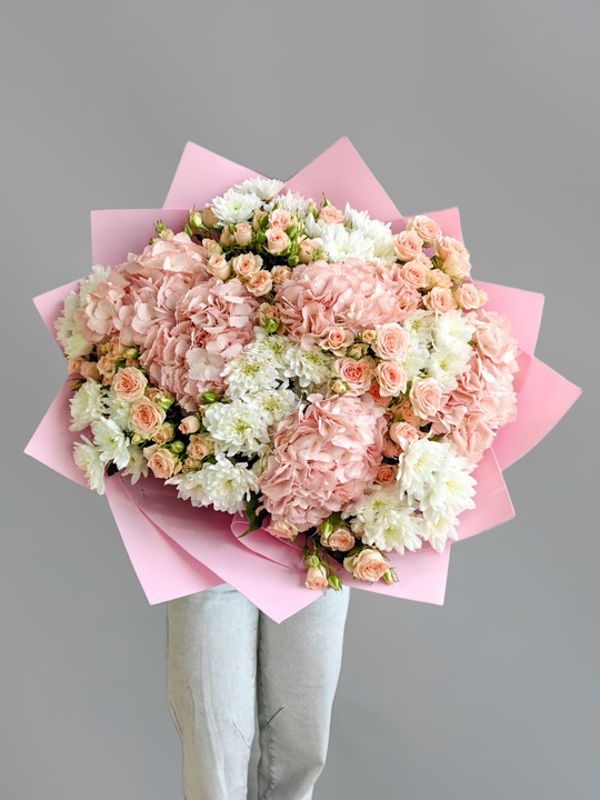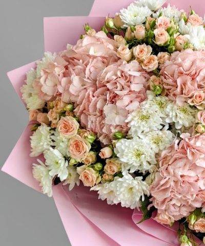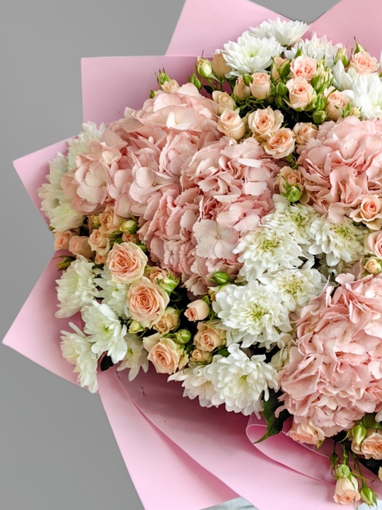 Сборный букет с хризантемами, гортензий и кустовыми розами Кустовая хризантема 8 шт Гортензия 5 шт Кустовая роза 10 шт В подарок: — Дизайнерская упаковка — Инструкция по уходу — Средство для продления жизни цветов 2 шт 🌷 Экспресс-доставка 🌷 Кешбэк от суммы заказа 🌷 Открытка в подарок 🌷 Фотоотчет перед отправкой