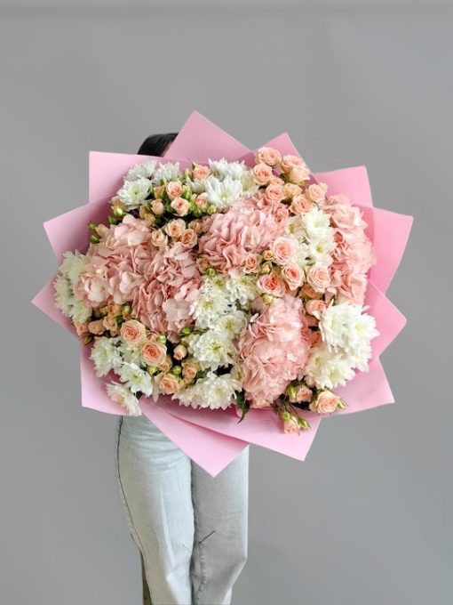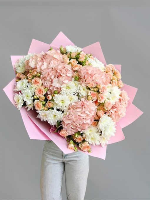Сборный букет с хризантемами, гортензий и кустовыми розами Кустовая хризантема 8 шт Гортензия 5 шт Кустовая роза 10 шт В подарок: – Дизайнерская упаковка – Инструкция по уходу – Средство для продления жизни цветов 2 шт 🌷 Экспресс-доставка 🌷 Кешбэк от суммы заказа 🌷 Открытка в подарок 🌷 Фотоотчет перед отправкой