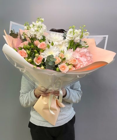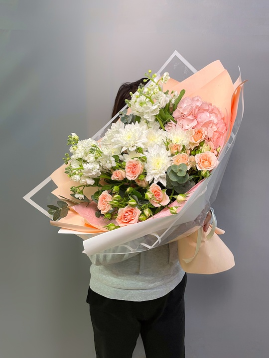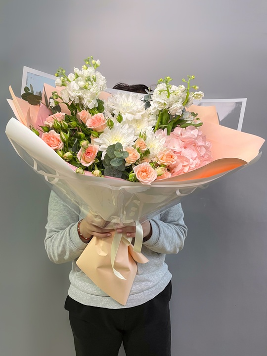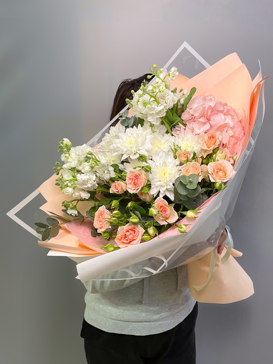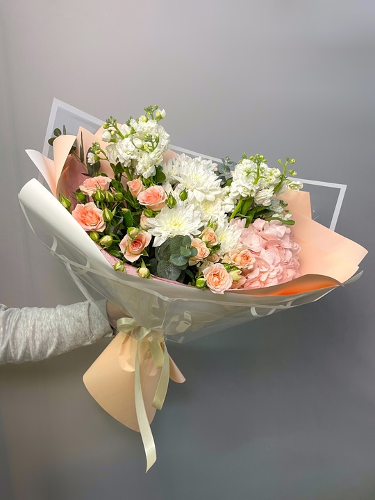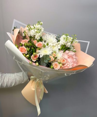 Сборный букет с хризантемой, кустовой розой и маттиоллой Ширина 35см, высота 45см В составе: Гортензия 1 шт Маттиола 2 шт Кустовая роза 2 шт Махровая хризантема 2 шт Эвкалипт В подарок: — Дизайнерская упаковка — Инструкция по уходу — Средство для продления жизни цветов 2 шт 🌷 Экспресс-доставка 🌷 Кешбэк от суммы заказа 🌷 Открытка в подарок 🌷 Фотоотчет перед отправкой