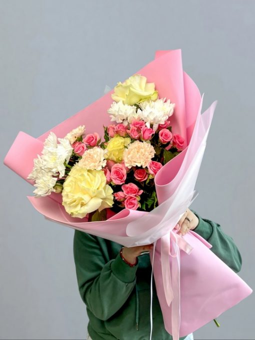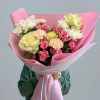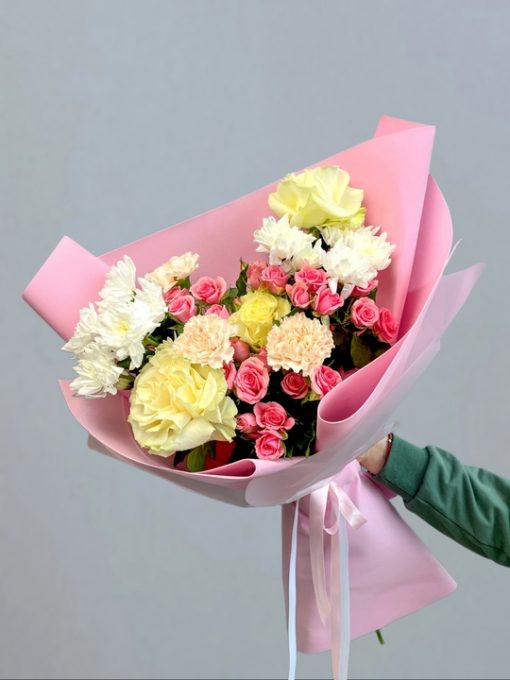 Сборный букет с розой диантусом и хризантемой Французская роза 3 шт Кустовая роза 5 шт Диантус 5 шт Хризантема 2 шт Упаковка В подарок: – Дизайнерская упаковка – Инструкция по уходу – Средство для продления жизни цветов 2 шт 🌷 Экспресс-доставка 🌷 Кешбэк от суммы заказа 🌷 Открытка в подарок 🌷 Фотоотчет перед отправкой