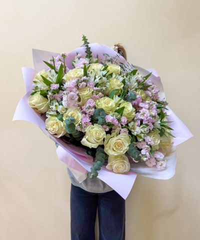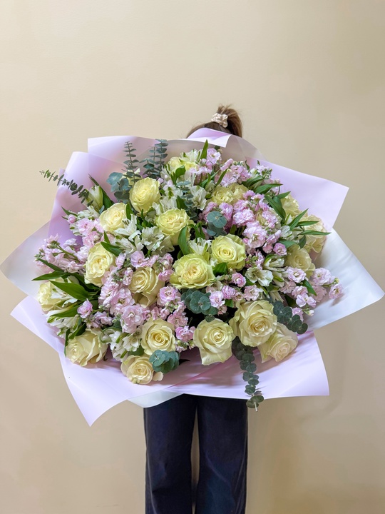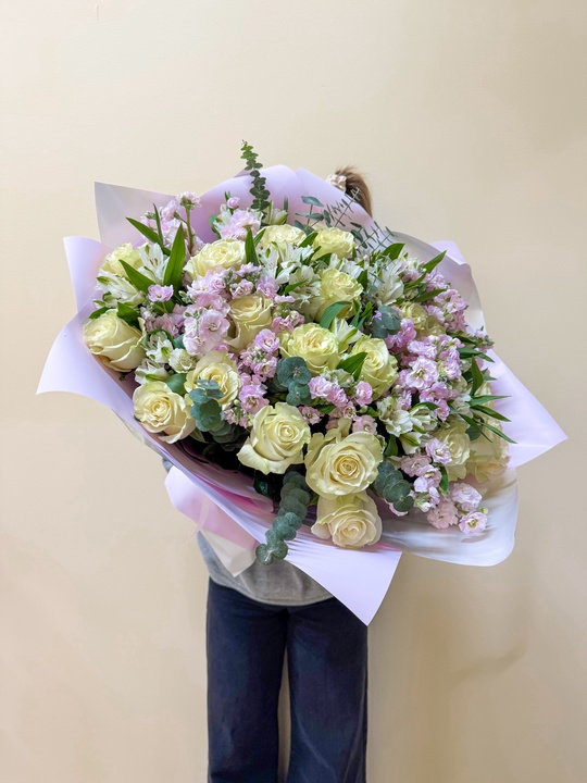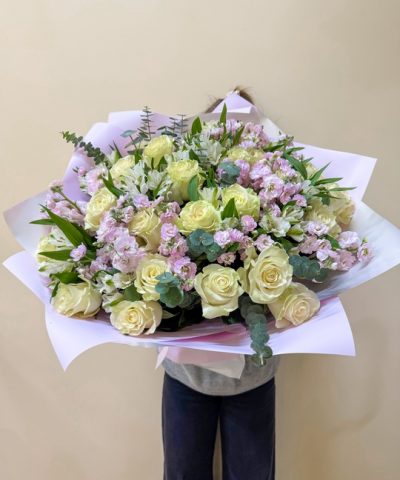 Сборный букет с розой, маттиолой и альстромерией Ширина 55см, высота 55см В составе: Маттиола 10шт Эвкалипт Альстромерия 10шт Эквадор 25шт В подарок: — Дизайнерская упаковка — Инструкция по уходу — Средство для продления жизни цветов 2 шт 🌷 Экспресс-доставка 🌷 Кешбэк от суммы заказа 🌷 Открытка в подарок 🌷 Фотоотчет перед отправкой