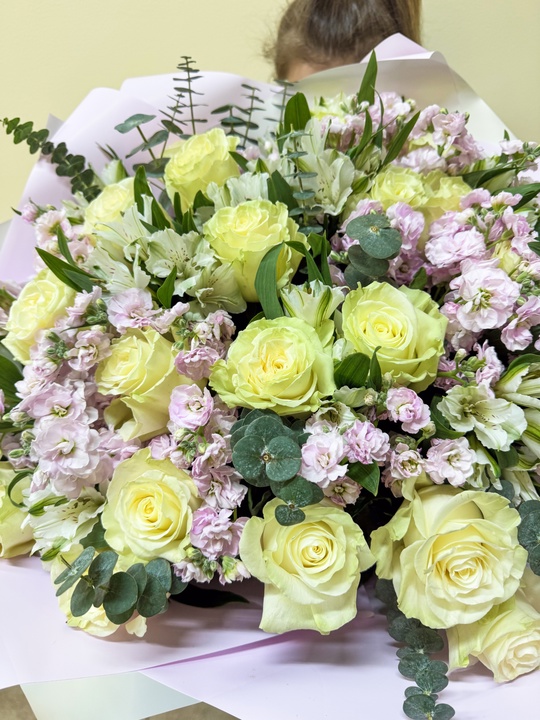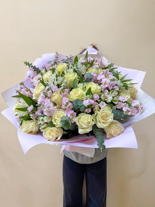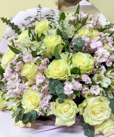 Сборный букет с розой, маттиолой и альстромерией Ширина 55см, высота 55см В составе: Маттиола 10шт Эвкалипт Альстромерия 10шт Эквадор 25шт В подарок: — Дизайнерская упаковка — Инструкция по уходу — Средство для продления жизни цветов 2 шт 🌷 Экспресс-доставка 🌷 Кешбэк от суммы заказа 🌷 Открытка в подарок 🌷 Фотоотчет перед отправкой