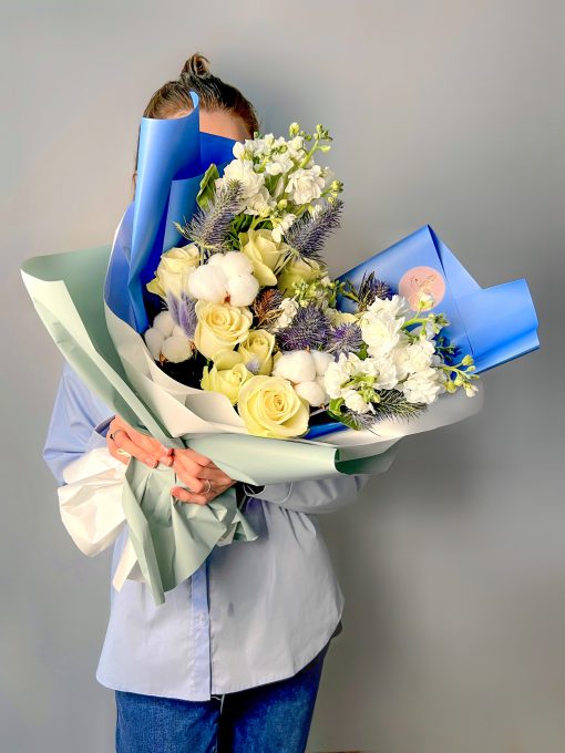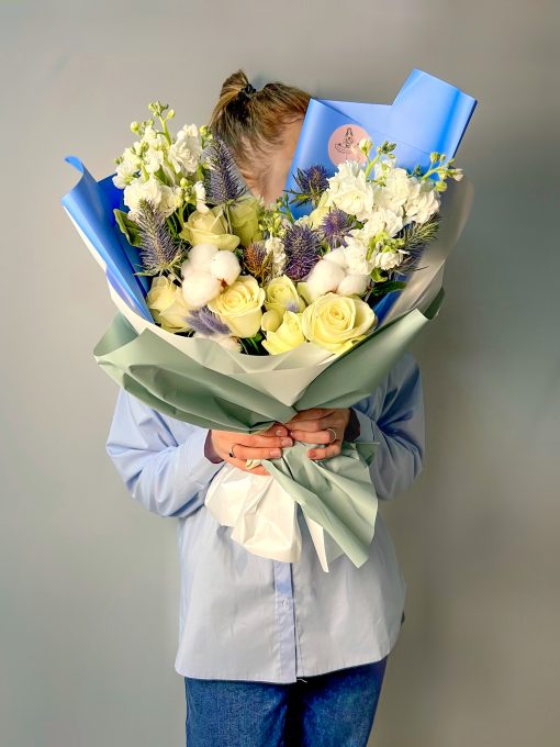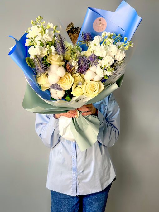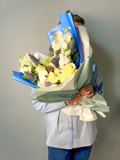 Сборный букет с розой, маттиолой и эрингиумом🪻 В составе: Эрингиум 2 шт Роза Кения белая 7 шт Маттиола 2 шт Лагурус 2 шт Хлопок 3 шт Упаковка Ширина 40 см, высота 45 см – Дизайнерская упаковка – Инструкция по уходу – Средство для продления жизни цветов 2 шт 🌷 Экспресс-доставка 🌷 Кешбэк от суммы заказа 🌷 Открытка в подарок 🌷 Фотоотчет перед отправкой