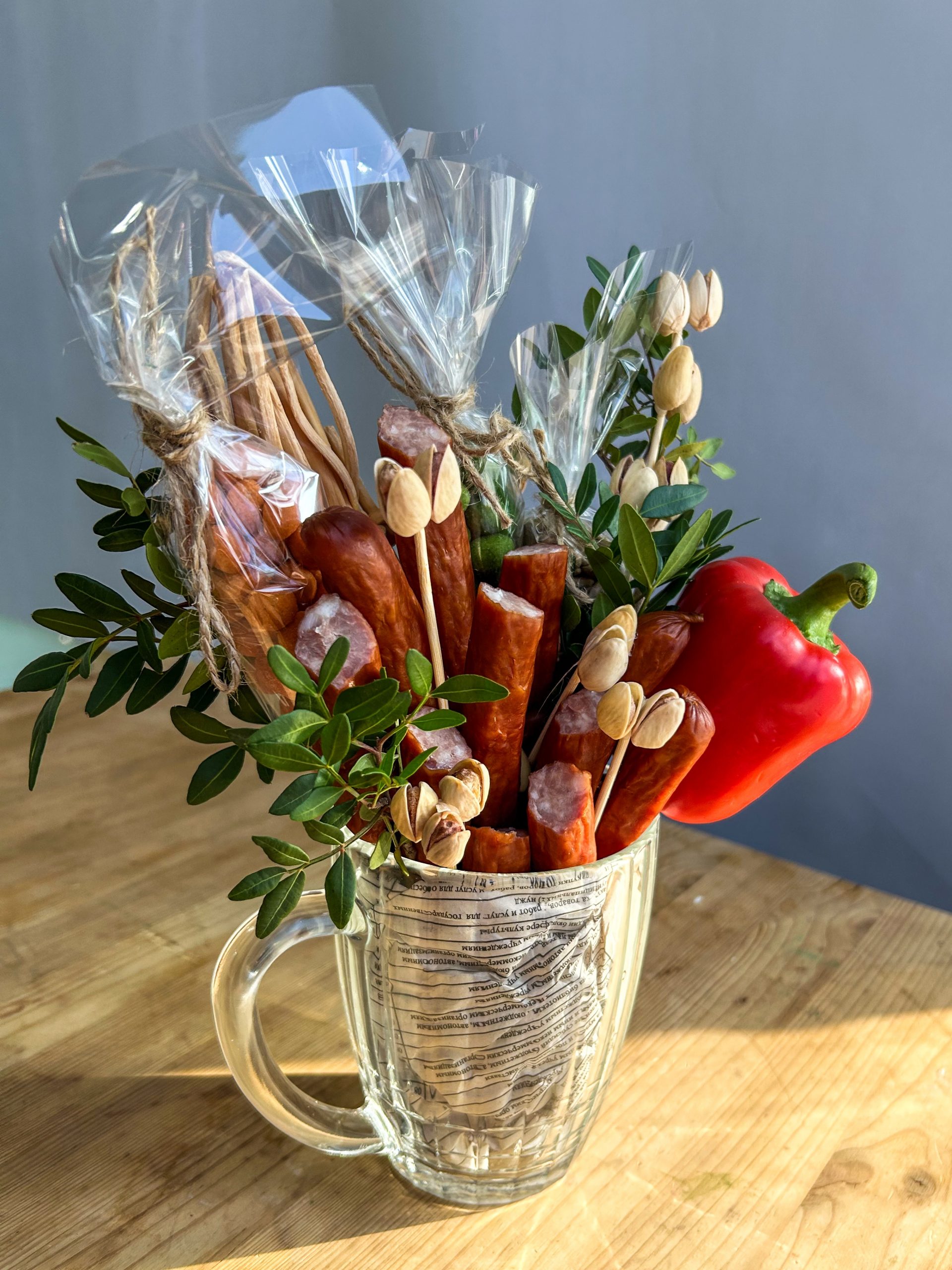 копченые колбаски, перец, фисташки, снеки, копченый сыр, декор в виде зелени и бумаги, кружка.