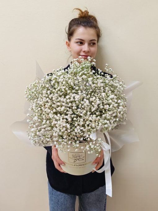 Коробка из белой гипсофилы🌹 В составе: -5 гипсофил -флористическая губка -шляпная коробка с атласной лентой Размер: Высота 35см, ширина 30см. – Дизайнерская упаковка – Инструкция по уходу – Средство для продления жизни цветов 2 шт 🌷 Экспресс-доставка 🌷 Кешбэк от суммы заказа 🌷 Открытка в подарок 🌷 Фотоотчет перед отправкой
