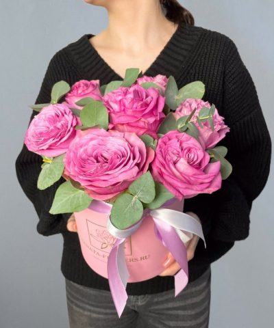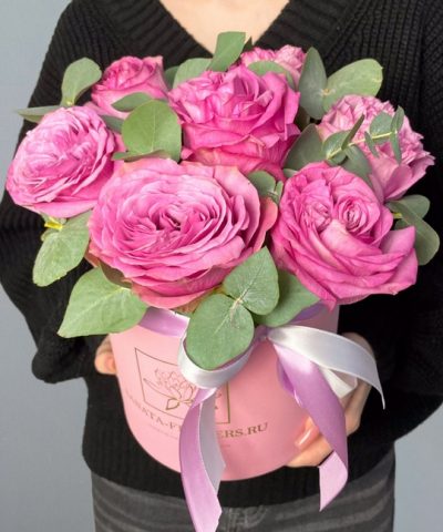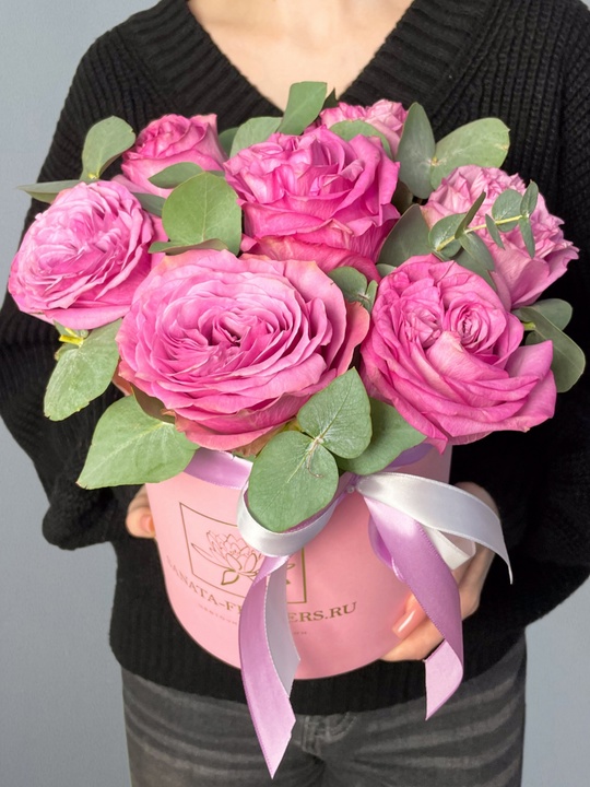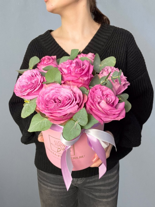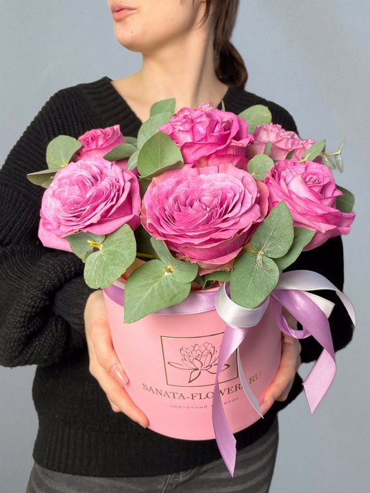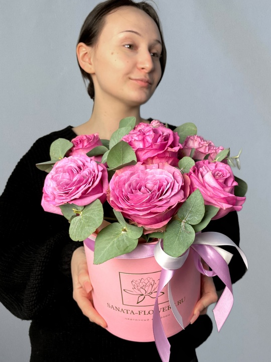 Шляпная коробка с пионовидными розами и эвкалиптом В составе: Пионовидные розы 7 шт Эвкалипт 2 шт Коробка, оазис В подарок: — Дизайнерская упаковка — Инструкция по уходу — Средство для продления жизни цветов 2 шт 🌷 Экспресс-доставка 🌷 Кешбэк от суммы заказа 🌷 Открытка в подарок 🌷 Фотоотчет перед отправкой
